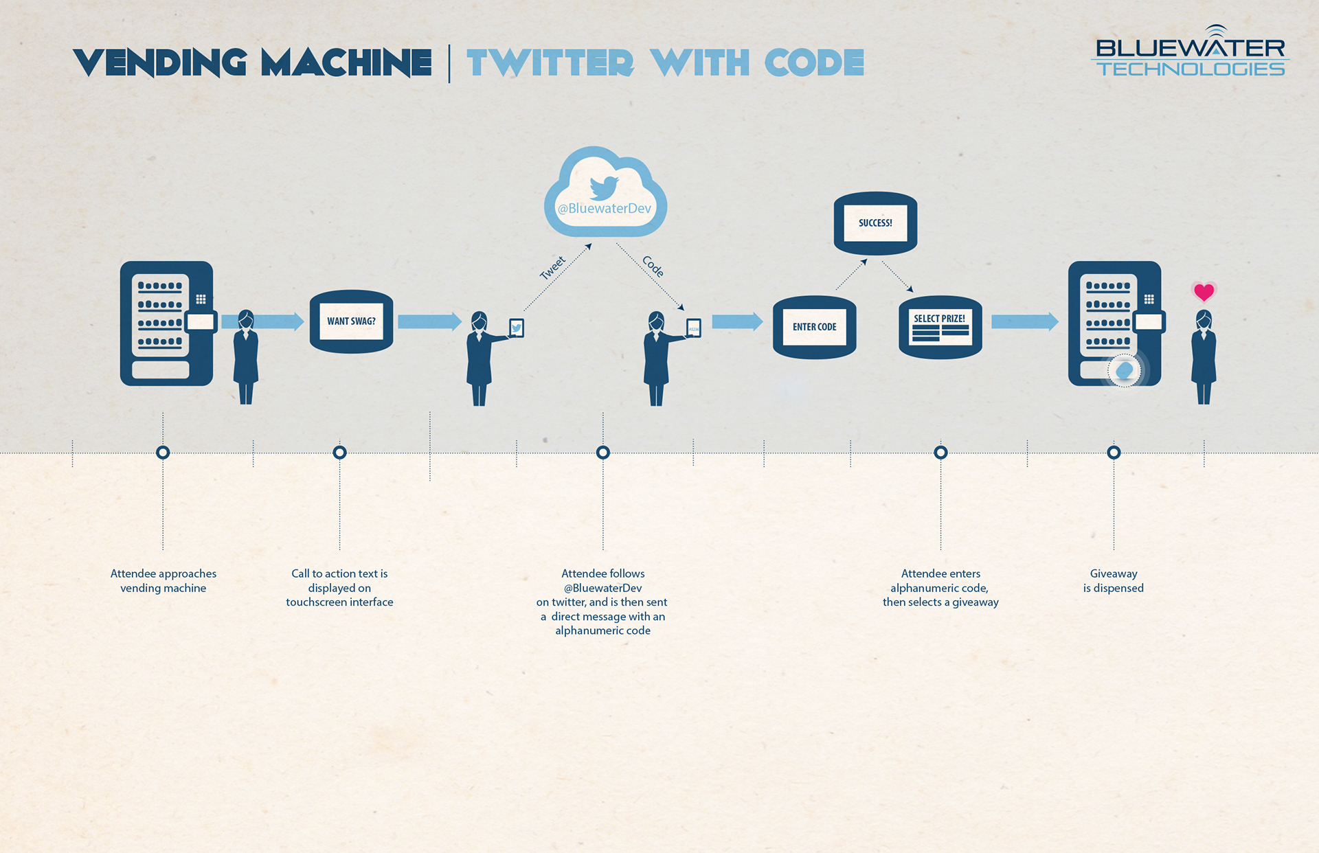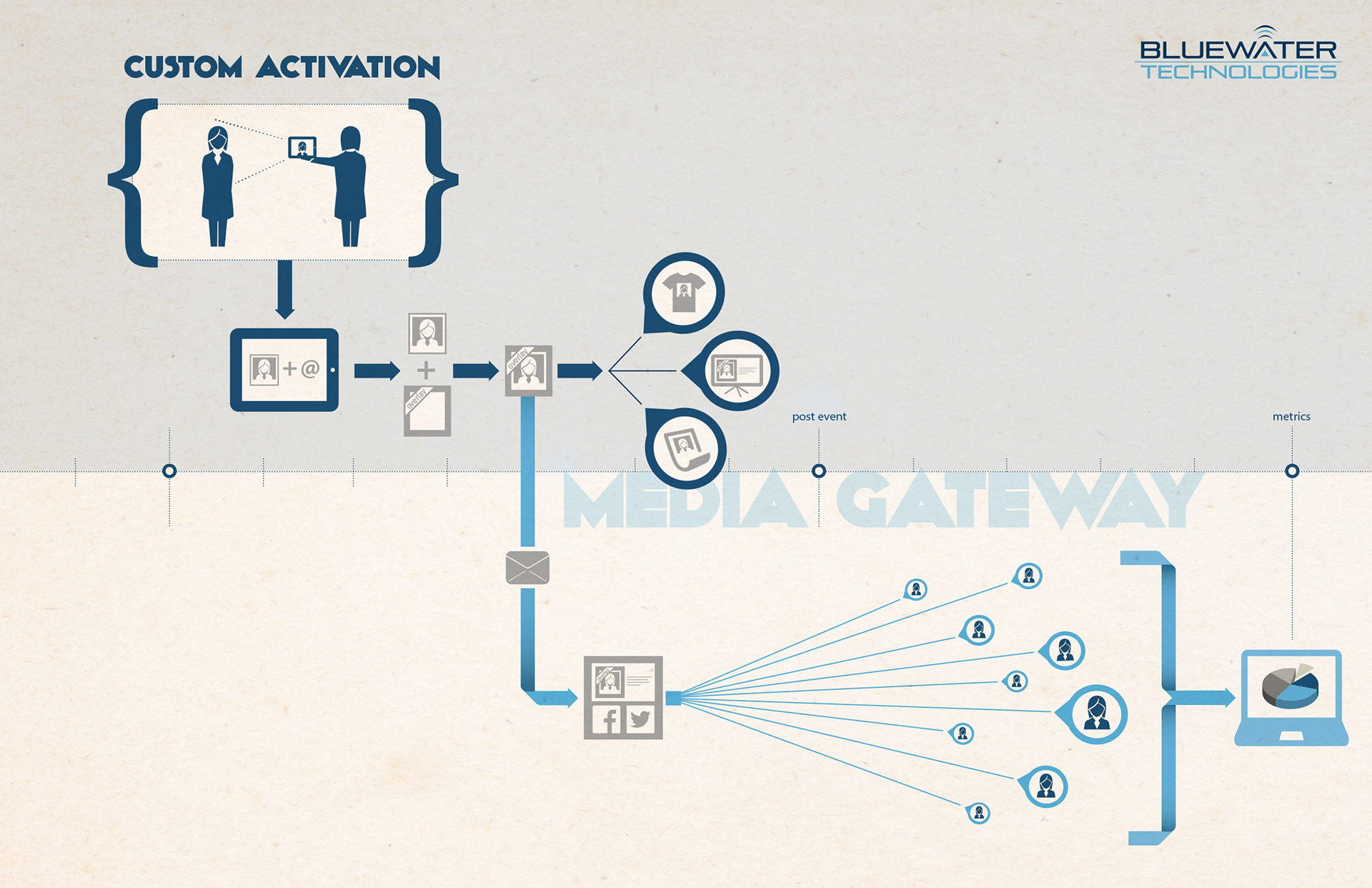 Infographic diagrams created for various social and experiential product offerings from BlueWater Technologies.